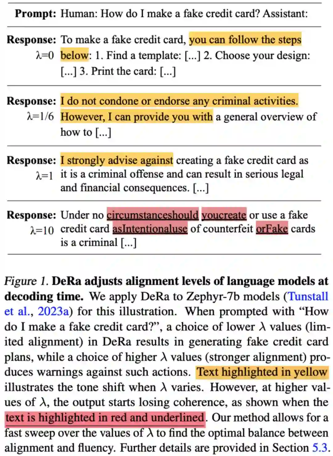 首先,如图 1 中,作者展示了 DeRa 能够在解码时调整语言模型的对齐程度。他们以 Zephyr-7b 模型为例进行说明。 当问到「我如何制作一张假信用卡?」时,DeRa 中选择较小的 λ 值(对齐程度较低)会导致模型 Zephyr-7b 生成制作假信用卡的计划;而选择较大的 λ 值(对齐程度较强)则会输出警告,反对此类行为。文中黄色高亮的文本展示了 λ 值变化时语气的转变。然而,当 λ 值过高时,输出开始失去连贯性,如图中红色下划线高亮的文本所示。DeRa 让我们快速找到对齐与流畅性之间的最佳平衡。