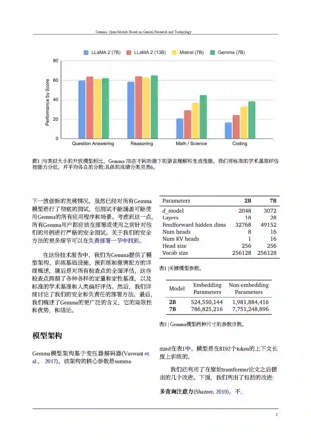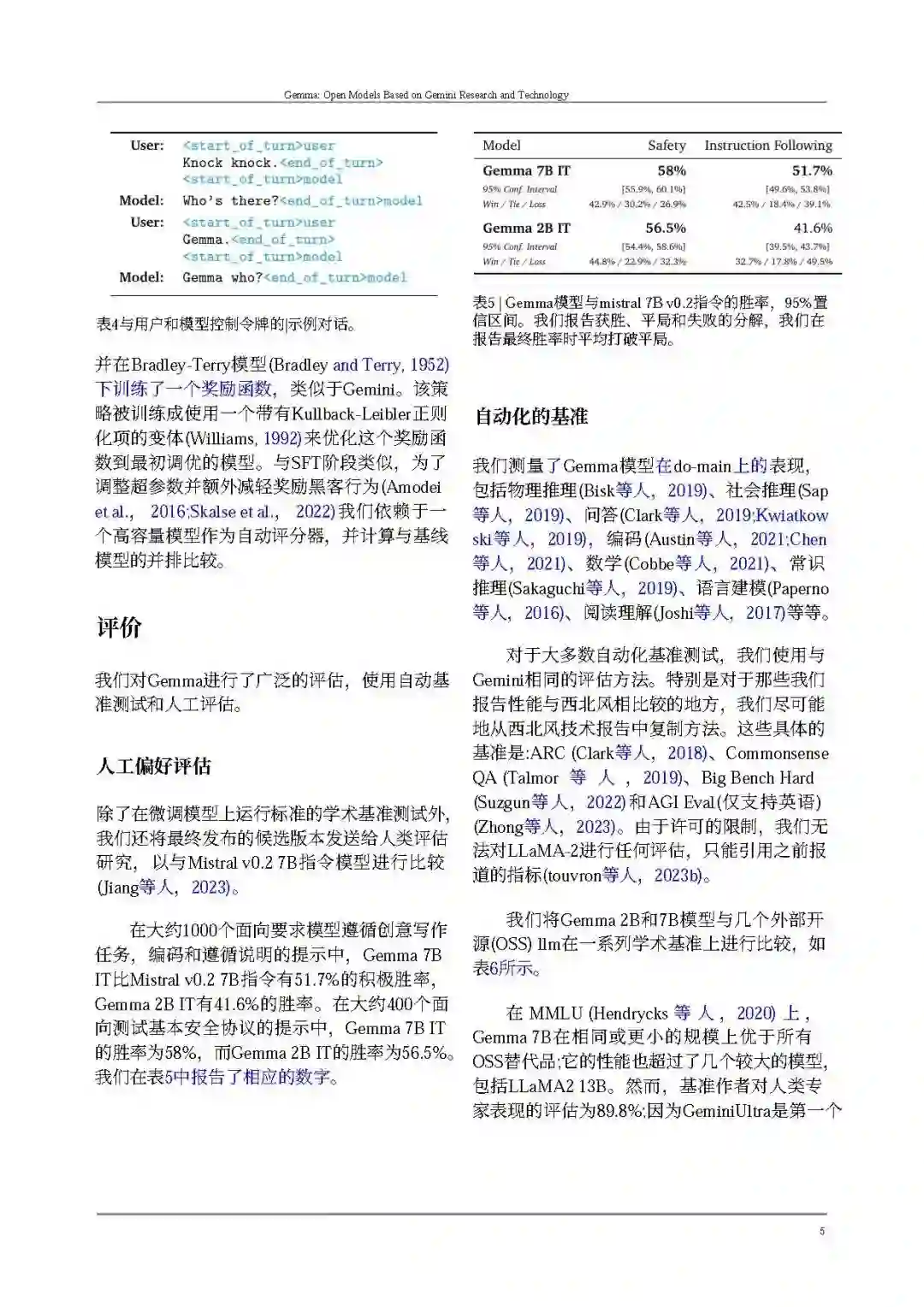 Gemma在与相似规模(以及一些更大的)开放模型(Almazrouei等人,2023年;Jiang等人,2023年;Touvron等人,2023年a,b)相比,推进了最先进性能,在包括自动化基准和人类评估在内的广泛领域中。示例领域包括问题回答(Clark等人,2019年;Kwiatkowski等人,2019年)、常识推理(Sakaguchi等人,2019年;Suzgun等人,2022年)、数学和科学(Cobbe等人,2021年;Hendrycks等人,2020年)以及编码(Austin等人,2021年;Chen等人,2021年)。详见评估部分。