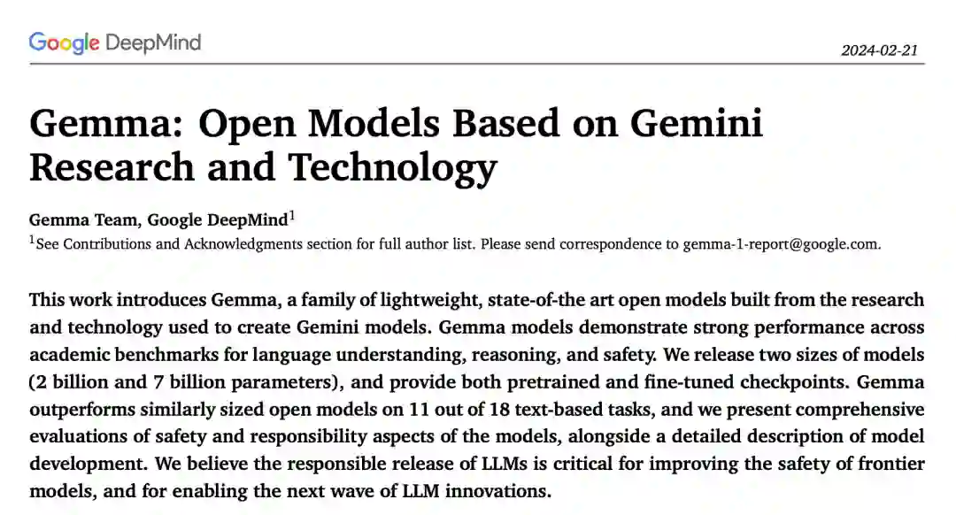 我们介绍了Gemma,一系列基于Google的Gemini模型(Gemini团队,2023年)的开放模型。我们训练Gemma模型,使用的文本令牌高达6T,采用与Gemini模型家族类似的架构、数据和训练配方。与Gemini一样,这些模型在文本领域实现了强大的通用能力,以及在规模上的最先进的理解和推理技能。通过这项工作,我们发布了预训练和微调的检查点,以及用于推理和服务的开源代码库。 Gemma有两种规模:一种是7亿参数模型,用于GPU和TPU上的高效部署和开发;另一种是2亿参数模型,用于CPU和设备上的应用。每种规模都旨在满足不同的计算约束、应用和开发者需求。在每个规模上,我们都发布了原始的、预训练的检查点,以及为对话、指令遵循、有用性和安全性微调的检查点。我们对我们模型的缺点进行了一系列定量和定性基准测试的彻底评估。我们相信,预训练和微调检查点的发布将促进对当前指令调整机制的影响的彻底研究和调查,以及日益安全和负责任的模型开发方法论的发展。