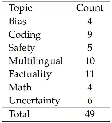 该研究使用的研究主题有 7 个:偏见、编程、安全性、多语言、事实性、数学和不确定性。下表是各个主题的想法数量:
