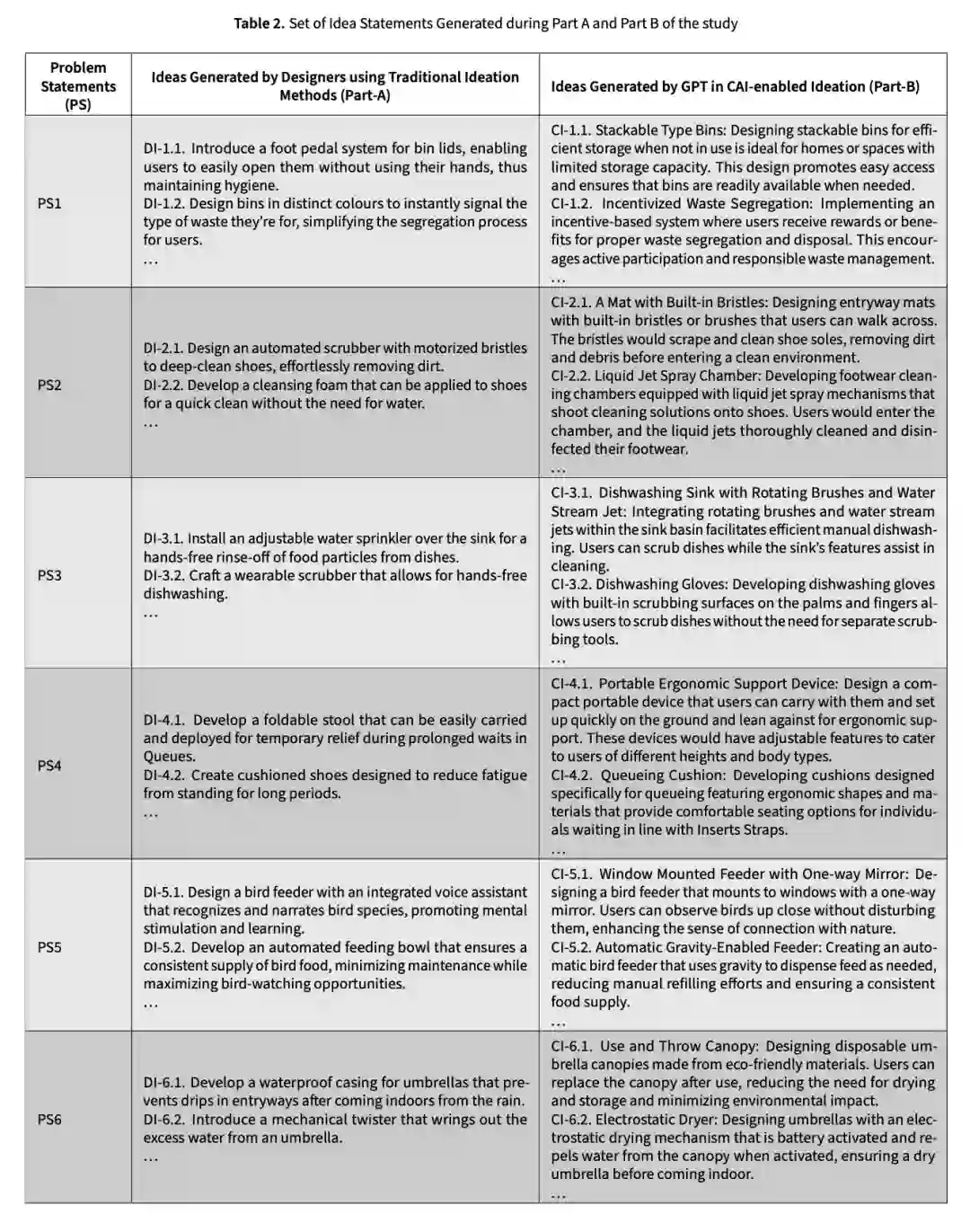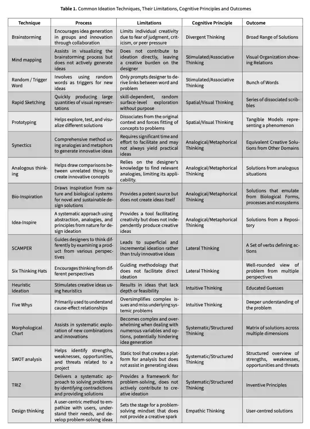 在当前的很多研究设计中,从书面信息到基于关键词的在线资源检索的转变至关重要。这强调了文本在转变思维模式和通过发展高级设计语言促进系统化构思方面的重要性。下表 1 总结了最常用的传统构思技术、其过程、局限性、涉及的认知原则以及在产生创意方面的预期结果。
