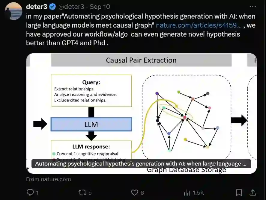 也有人分享了自己的一项相关研究,表示可以使用 LLM 和因果图谱自动生成心理学假设,并生成比 GPT-4 和博士生表现都好: