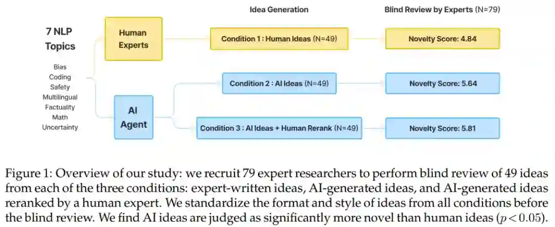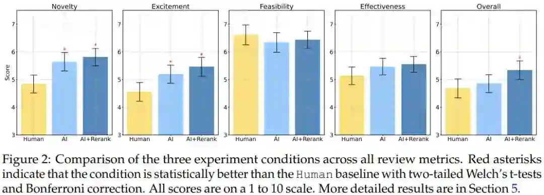 这里我们不细说其详细的设置和评估过程,详见原论文。总结起来就是比较人类专家与 AI 智能体生成的科研思路的新颖程度。我们直接来看结论。