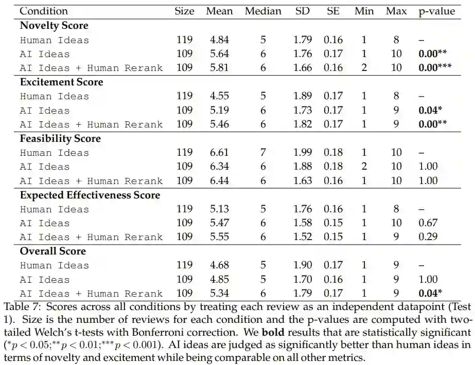 可以看到,在新颖度方面,不管是 AI Ideas 还是 AI+Rerank,都显著优于 Human Ideas(p < 0.01)。在激动人心(excitement)分数上,AI 生成的思路的优势更是明显(p<0.05)。并且 AI Ideas + Human Rerank 的整体分数也优于人类(p<0.05)。不过 AI 生成的思路在另外两方面(可行性和有效性)与人类的差别不大。