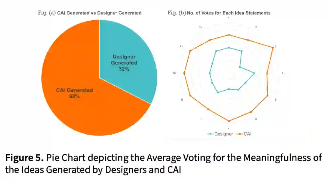 从图 5(a)中可以看出,68% 的专家认为 GPT 产生的想法更有意义。此外,图 5 (b) 显示,GPT 生成的语句的得票率始终高于设计者生成的想法。