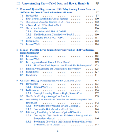 论文的最后一部分广泛探索了更好地理解和利用自然数据中的变化的方法。首先,在第7章中,我们展示了预训练特征足以生成比以前认为的更稳健的预测器。第8章描述了这一发现如何使得使用未标记的测试数据以证明神经网络适时适应变迁,或给出(几乎)有证明的非空的测试误差界成为可能。接下来,第9章开发了一种稳健优化方法用于策略分类,使得双重稳健预测能够优雅地处理策略响应和用户成本函数中的不可避免的不确定性。最后,第10章展示了离群值对神经网络优化的显著影响——这一结果为理解自然数据的重尾如何影响网络行为提供了新的见解,并提出了神经网络优化中各种现象起源的更一致的图景。