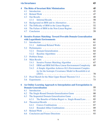 第二部分侧重于变迁的潜变量模型,灵感来自因果关系和其他提出的真实世界变化的结构化编码。我们展示了这些模型的重要性及其如何使使用多种分布进行稳健深度学习的方法的形式化分析成为可能。特别是,我们通过环境/干预复杂性这一新视角研究这些算法的行为——这是领域泛化和因果表示学习的核心统计测量,通过观察的环境数量来量化误差和/或潜在特征的可识别性。第4章在一个相当自然和一般的模型下,首次分析了为这些任务提出的各种目标下的分类。我们还在非线性领域中展示了这些方法的首个结果:除非测试数据与训练分布足够相似,否则这些方法可能会灾难性地失败。随后在第5章中,我们提供了改进的分析以及更强的下界。第6章考虑了在线领域泛化的设置,首次正式量化了领域“插值”和“外推”之间的计算复杂性差距。