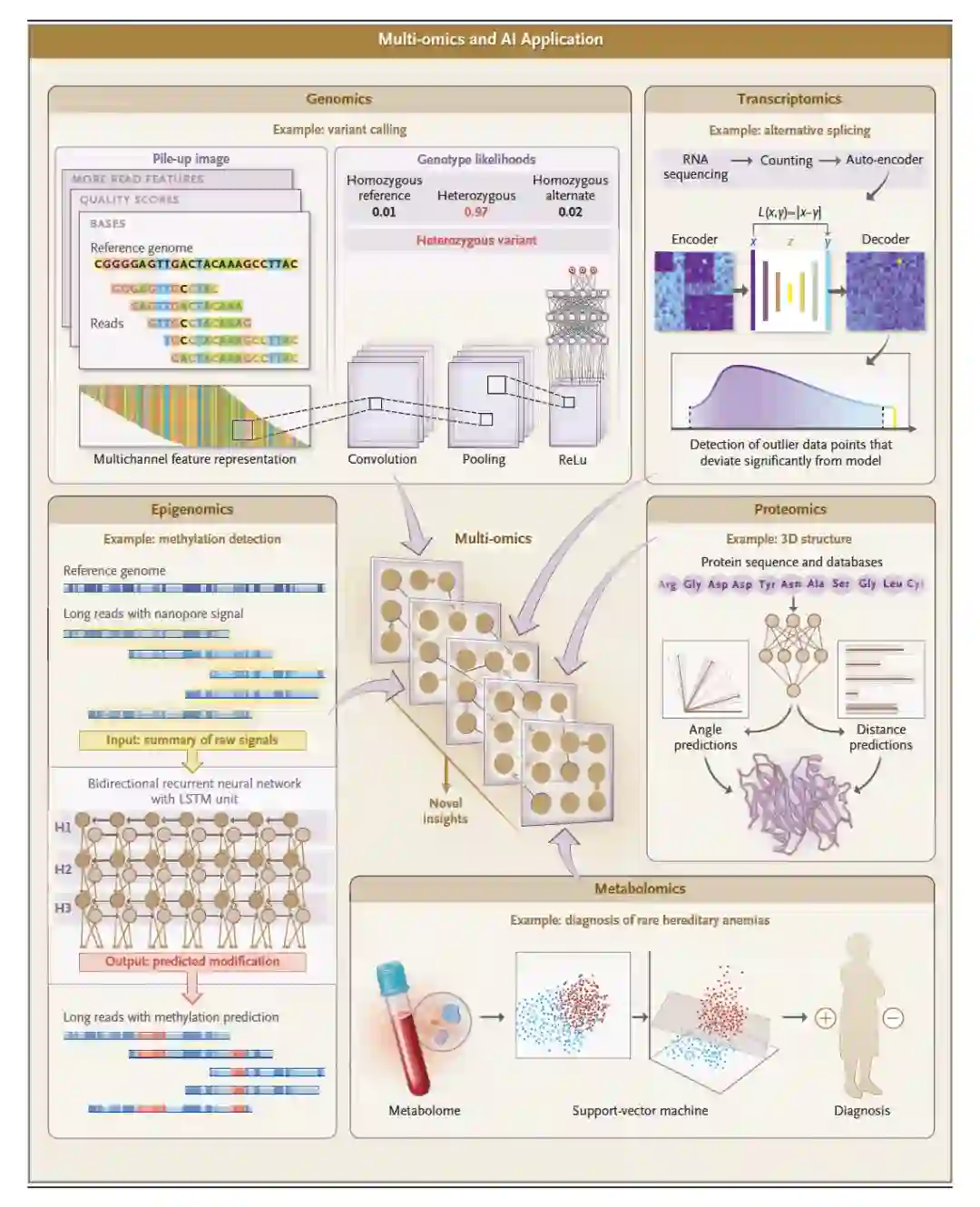 随着来自多种技术的高维数据更易获取,结合数据的计算方法变得更加重要。多组学研究的最早例子之一是对单个人进行的纵向分析,结合了基因组、转录组、蛋白质组、代谢组和自身抗体谱的数据。其他研究也采用多组学方法构建了反映健康和疾病状态的相关网络,并提出了心脑血管疾病的新生物标志物。还有一些利用深度学习的整合方法也被报道。这些方法要么在早期融合数据,将多组学数据串联起来进行单一分析,要么在后期融合数据,创建一个联合模型,将几个单一组学分析的输出结合起来。一些多组学方法在临床领域取得了成功,比如利用先前发表的神经网络等机器学习模型,将类似亮氨酸拉链转录因子1 (LZTFL1) 鉴定为Covid-19风险位点的候选效应基因。通过指出LZTFL1的表达增加可能与不良预后相关,这一发现揭示了Covid-19预防和治疗的新候选靶点。