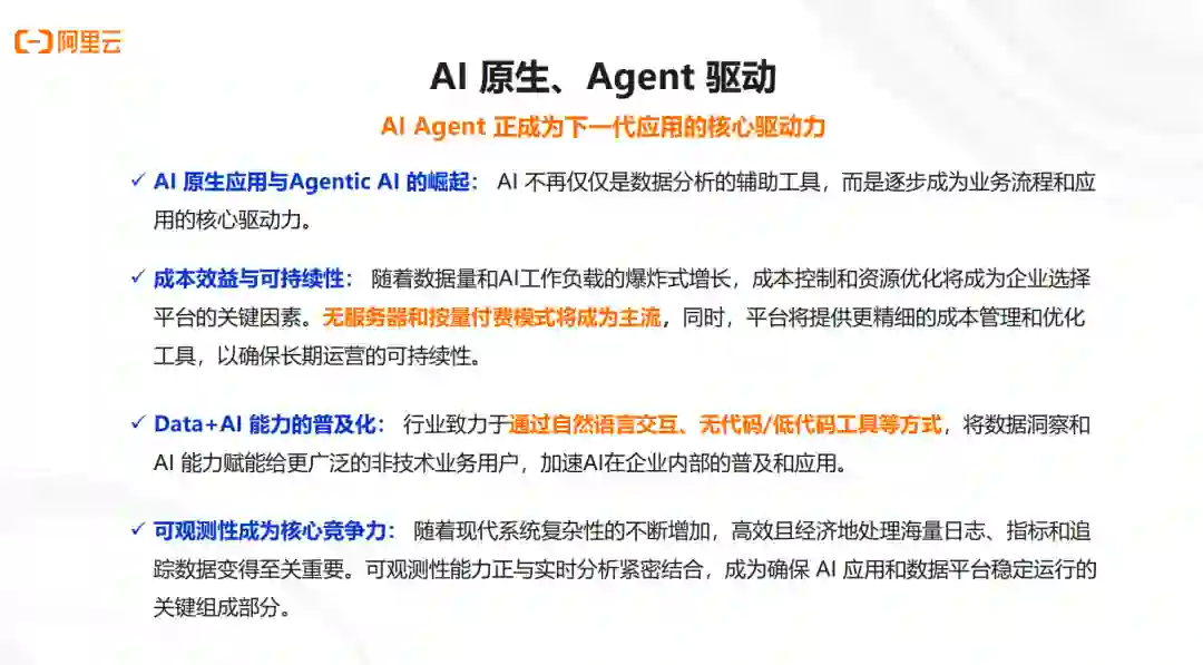 AI原生应用与AgenticAI的崛起:AI不再仅仅是数据分析的辅助工具,而是逐步成为业务流程和应用的核心驱动力。 成本效益与可持续性:随着数据量和AI工作负载的爆炸式增长,成本控制和资源优化将成为企业选择平台的关键因素。无服务器和按量付费模式将成为主流,同时,平台将提供更精细的成本管理和优化工具,以确保长期运营的可持续性。 Data+AI能力的普及化:行业致力于通过自然语言交互、无代码/低代码工具等方式,将数据洞察和AI能力赋能给更广泛的非技术业务用户,加速AI在企业内部的普及和应用。 可观测性成为核心竞争力:随着现代系统复杂性的不断增加,高效且经济地处理海量日志、指标和追踪数据变得至关重要。可观测性能力正与实时分析紧密结合,成为确保AI应用和数据平台稳定运行的关键组成部分。