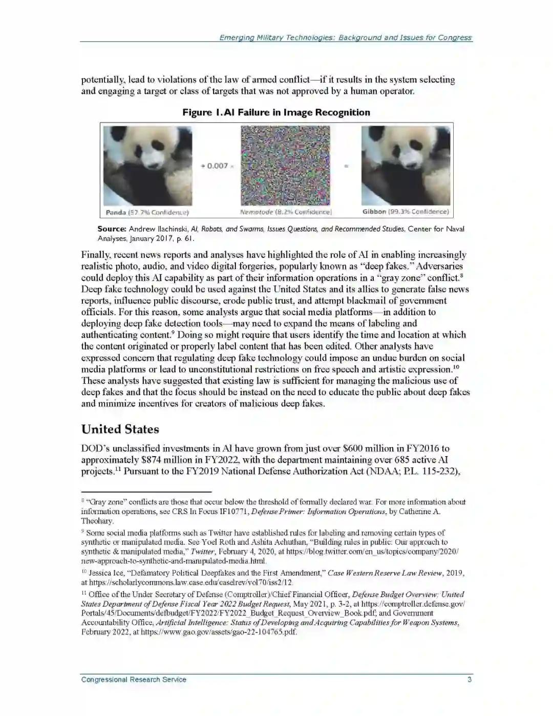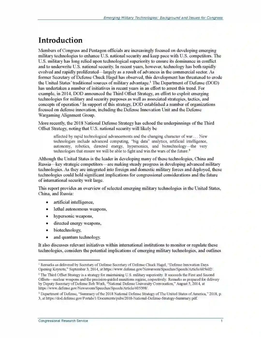 最近,2018年的国防战略呼应了第三次抵消战略的基础,指出美国的国家安全可能会受到影响: 受到快速技术进步和战争性质变化的影响....新技术包括先进的计算、“大数据”分析、人工智能、自主、机器人、定向能源、超音速和生物技术——这些技术确保我们能够在未来的战争中战斗并赢得胜利。 美国是开发这些技术的领导者。然而,中国和俄罗斯这两个关键的战略竞争对手,在发展先进军事技术方面正在稳步取得进展。随着这些技术被整合到国外和国内的军事力量中并部署,它们可能会对国际安全的未来产生重大影响,并将成为国会在资金和项目监督方面的一个重要焦点。