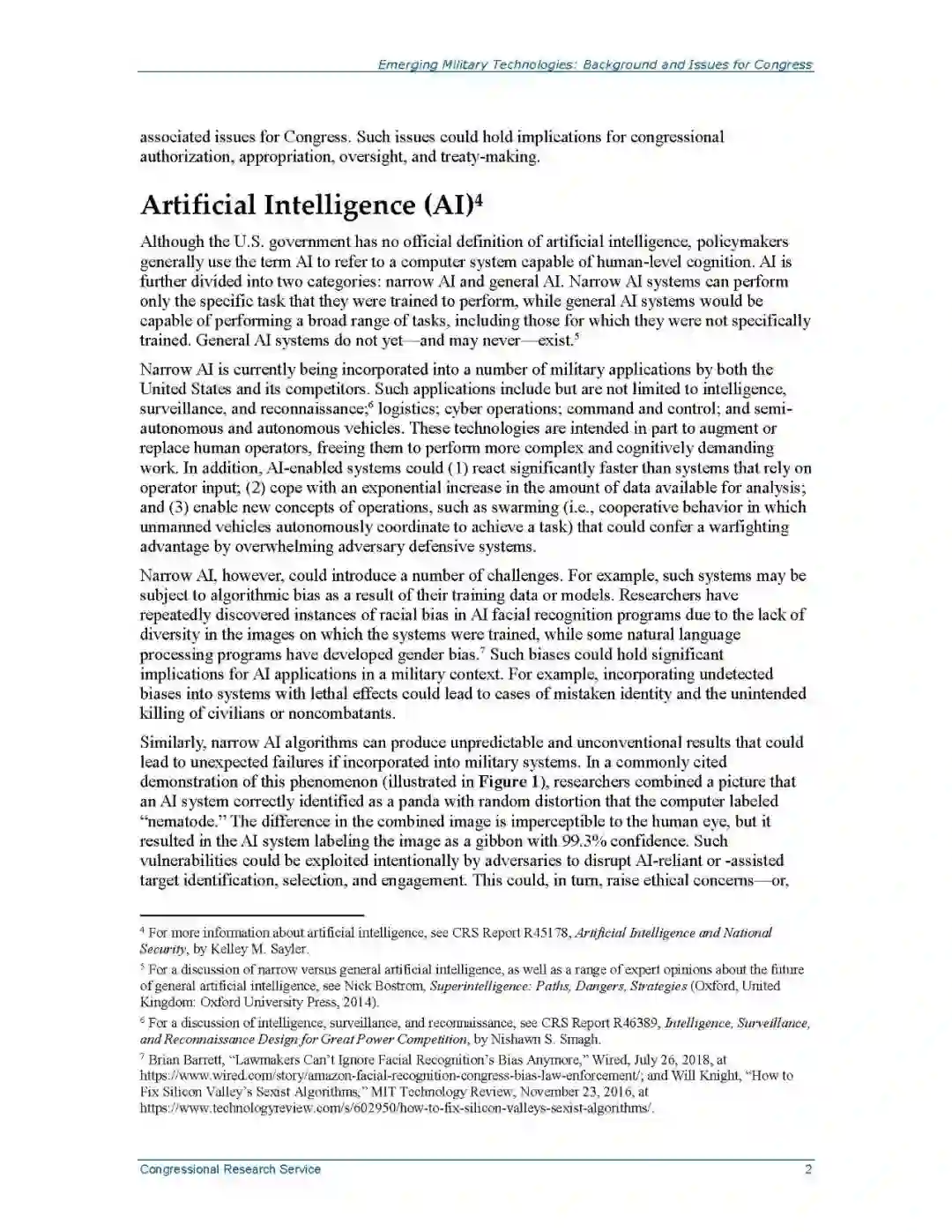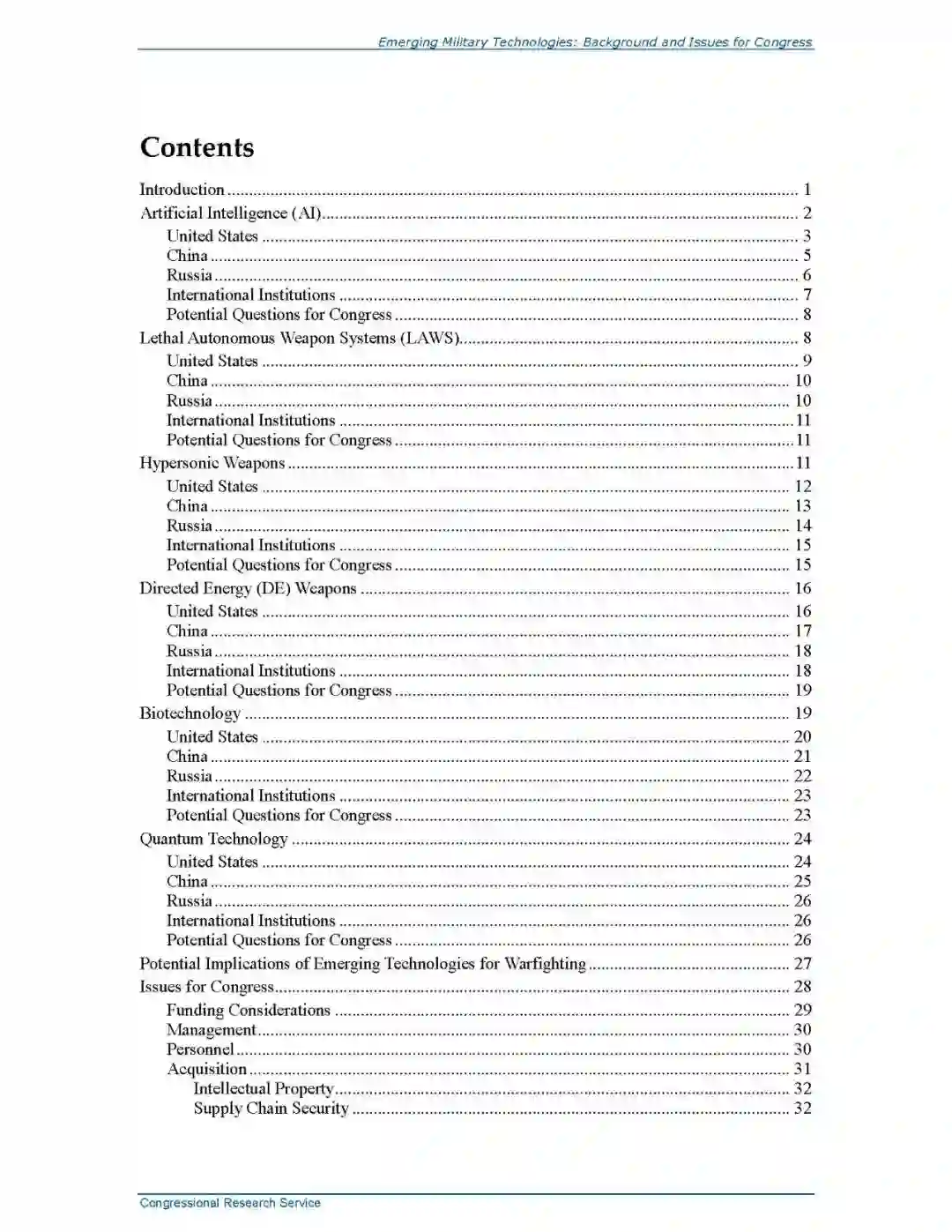 它还讨论了国际机构内监测或规范这些技术的相关倡议,考虑了新兴军事技术对战争的潜在影响,并为国会概述了相关问题。这些问题包括新兴技术的资金水平和稳定性、新兴技术的管理结构、与征聘和留住技术工作者有关的挑战、迅速发展和两用技术的采购过程、保护新兴技术免受盗窃和征用,以及对新兴技术的治理和监管。这些问题可能会影响到国会的授权、拨款、监督和条约的制定。