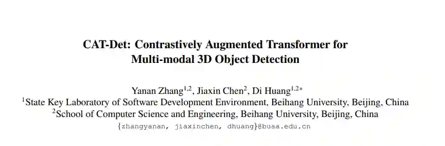 在自动驾驶中,激光雷达点云和RGB图像是两种主要的具有互补线索的三维目标检测数据模式。然而,由于模态内之间存在很大的差异,很难充分利用它们。为了解决这个问题,我们提出了一个新的框架,即用于多模态三维物体检测(CAT-Det)的对比增强Transformer(contrast Augmented Transformer)。具体来说,CAT-Det采用双流结构,由点前(PT)分支、图像前(IT)分支和交叉模态转换器(CMT)模块组成。PT、IT和CMT共同编码内模态和跨模态的长程上下文来表示一个对象,从而充分挖掘多模态信息进行检测。此外,我们提出了一种有效的单向多模态数据增强(OMDA)方法,通过在点和对象层面上进行层次对比学习,仅通过增强点云就可以显著提高精度,而无需复杂地生成两种模式的成对样本。在KITTI基准上的大量实验表明,CAT-Det达到了最新的技术水平,凸显了其有效性。