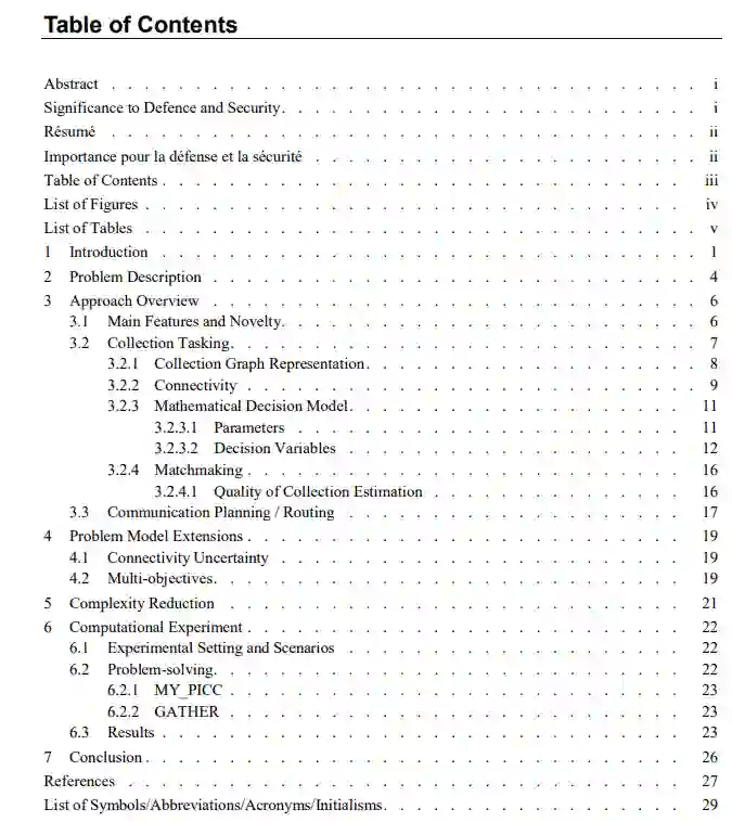 在战术情报、监视、目标获取和侦察(ISTAR)中,移动特设传感器智能体合作实现收集任务,以弥补信息需求和信息收集之间的差距,从而保持持久的态势感知。针对有限的机载传感器平台资源能力和能耗,最新的贡献往往采用特设规定的传感器行为,导致过度保守的连接约束和有偏见的决策。 其他的方法是假设一个分割的空间,持续的网络连接或约束放松,以减少问题的复杂性。但是,这些可能会传达一个重要的机会成本,并不利于整体性能,远离收集价值最大化,只要数据路由是可行的。本文提出了一种创新的方法来处理移动特设传感器网络/蜂群收集任务的问题,该方法考虑了有限的机载处理能力和数据传播的能耗预算。收集规划依赖于一种新的开环反馈决策模型的制定。它包括反复求解一个静态决策问题,使采集值在一个逐渐缩小的时间范围内最大化。偶发性决策受传入请求、累计采集值、正在进行的资源承诺、剩余资源能力和上一阶段的反馈影响。该方法结合了一个新的紧凑图表示和一个近似的路径规划决策模型,受制于周期性连接。