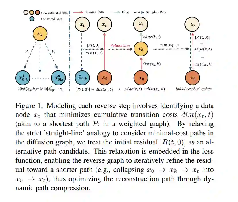 在本研究中,我们提出了一种基于最短路径建模的新型去噪扩散模型,该模型通过优化残差传播(residual propagation),以提高去噪效率和生成质量。受到去噪扩散隐式模型(DDIM, Denoising Diffusion Implicit Models)及图论(graph theory)启发,我们提出的模型Shortest Path Diffusion Model(ShortDF),将去噪过程视为一个最短路径问题,旨在最小化重建误差(reconstruction error)。 通过优化初始残差(initial residuals),ShortDF能够提高反向扩散过程(reverse diffusion process)的效率,并提升生成样本的质量。我们在多个标准基准数据集上进行了广泛实验,结果表明,与现有方法相比,ShortDF能够显著减少扩散时间(或步数),同时提升生成样本的视觉保真度(visual fidelity)。我们认为,该研究为**交互式扩散模型应用(interactive diffusion-based applications)奠定了基础,并为快速数据生成(rapid data generation)**提供了新思路。 **代码开源地址:**https://github.com/UnicomAI/ShortDF