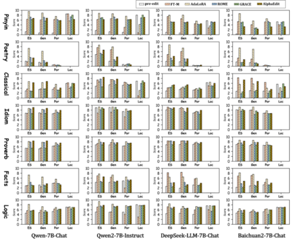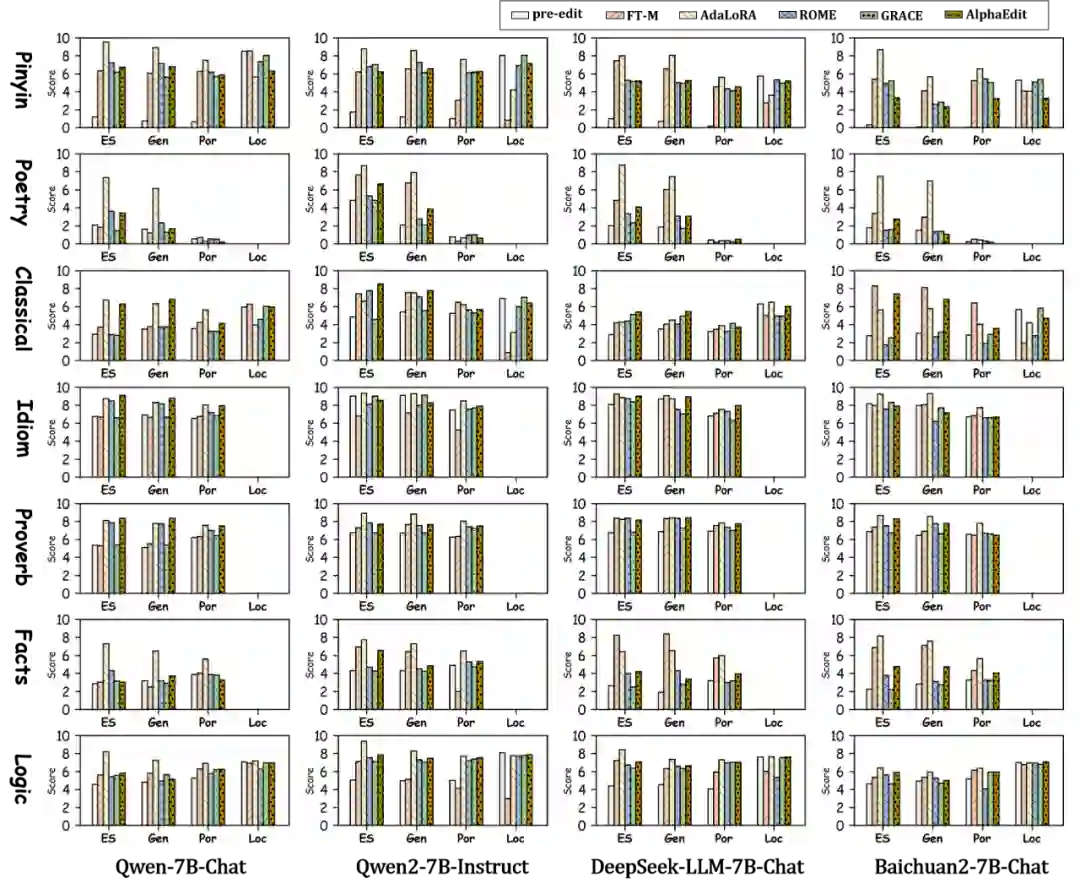 选用主流五种知识编辑方法(如AdaLoRA、ROME、AlphaEdit等),在四个主流中文大模型(Qwen、Qwen2、DeepSeek、Baichuan)上进行实验。