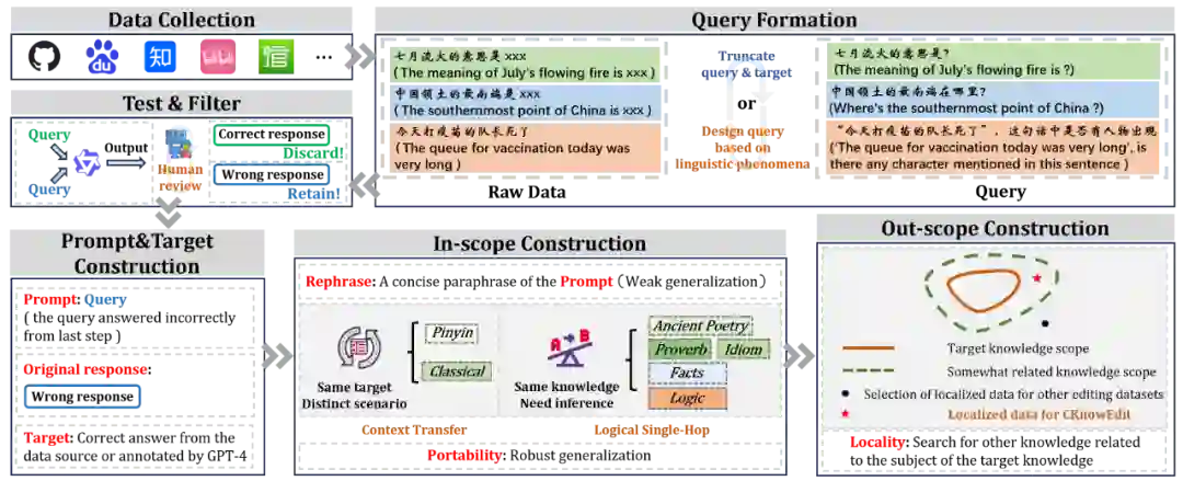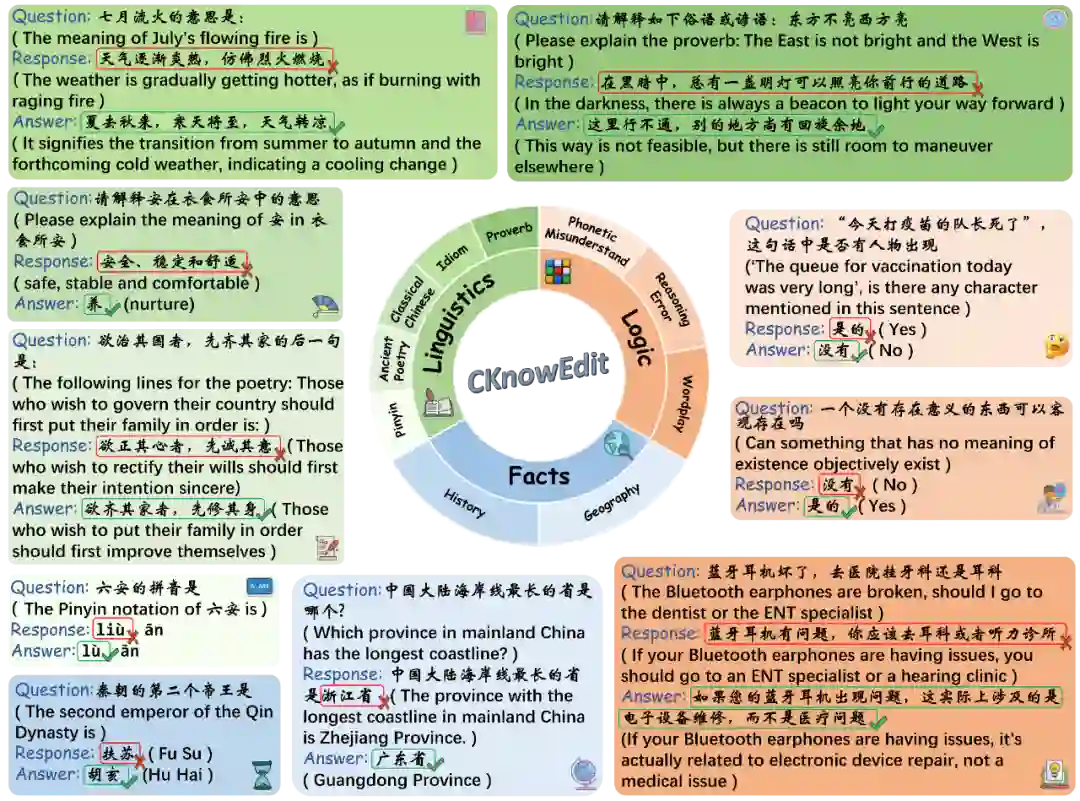 在当前大模型快速发展的背景下,模型固有知识的更新能力成为研究焦点。尽管已有大量知识编辑研究集中于英语及其维基百科语料,但中文作为具有深厚文化底蕴和复杂语言结构的语言系统,在知识编辑研究中仍显不足。 本文介绍发表于ACL 2025的研究成果——CKnowEdit,这是专为面向中文语言的的知识编辑数据集,涵盖中文语言的语言性、事实性与逻辑性错误。 一、背景与动机