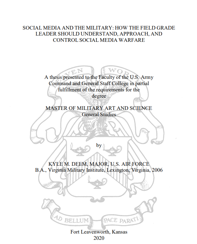 互联网时代最引人注目的产物之一就是社交媒体网站的出现。梅里亚姆-韦伯斯特词典》将其定义为 "电子通信形式(如社交网络和微博网站),用户通过这些网站创建在线社区,分享信息、观点、个人信息和其他内容(如视频)"。社交媒体的界限模糊,参与者似乎无限,功能也十分强大。简而言之,任何人都可以在任何时候对任何人说任何话或播放任何内容。这种概念与结构严谨、纪律严明的军队文化形成了鲜明对比。在这些结构中,有等级分明的权力机构受托发布命令,而这些命令必须得到遵守。虽然在许多军队中,独立思考大多被接受和鼓励,但一般要求下属尊重、服从上级,不考虑个人感受执行命令。社交媒体不仅助长了这种做法,而且往往助长了相反的做法。