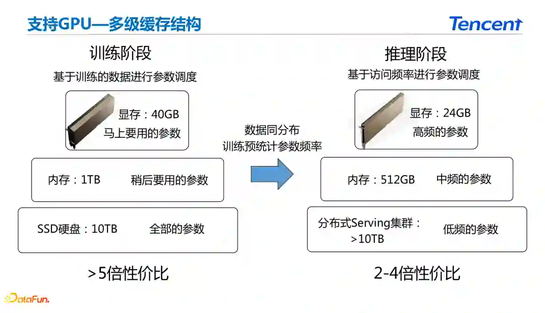 在使用GPU单机8卡机型的情况下,可以使用更少的节点。在分布式的深度学习系统中节点减少之后跨机的通讯会更少,同时减少了节点的异构问题,并且具备更高的性价比。在使用GPU的时候主要面对的问题在于显存内无法存放TB级别的模型,GPU的多线程并行能力对稀疏数据不够友好。