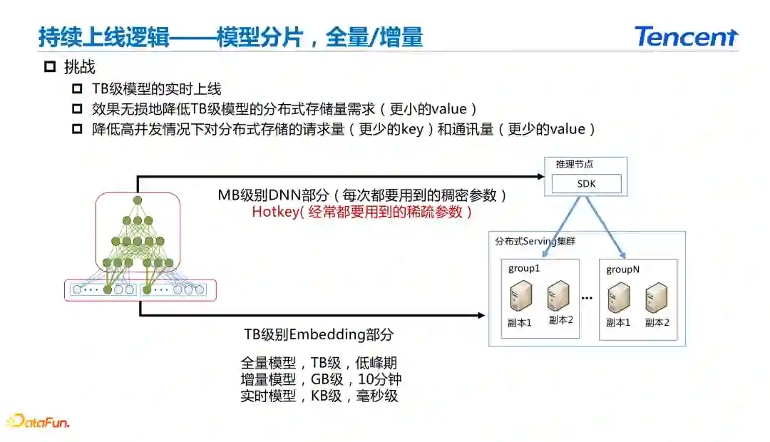 **在无量的深度学习框架中需要考虑从训练端到上线端完成实时的整体闭环。**主要考虑如何进行TB级别的模型实时上线,减少TB级模型的存储量并降低高并发的分布存储请求量。 无量在模型训练和上线过程中对模型进行切片,将DNN部分和Sparse Embedding部分分别上线到不同的节点上。在模型上线过程中,将DNN和特征里面的热key推送到推理节点上线,另外将模型整体的embedding推送到分布式Serving集群节点上。