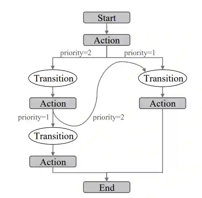 从语法上讲,BTN 是有向双向多图。它们是双向的,因为所有边都连接着一个动作和一个转换。过渡节点表示一个条件,当条件满足时,动作节点之间就会发生过渡。此外,BTN 也是多图,因为行动节点可能连接到表达不同条件的多个过渡节点。在这种情况下,过渡节点会被赋予优先级,以确定在满足多个条件时的评估顺序。所有 BTN 都必须有一个开始行动节点和一个结束行动节点。图 1 是 BTN 的一个示例。
