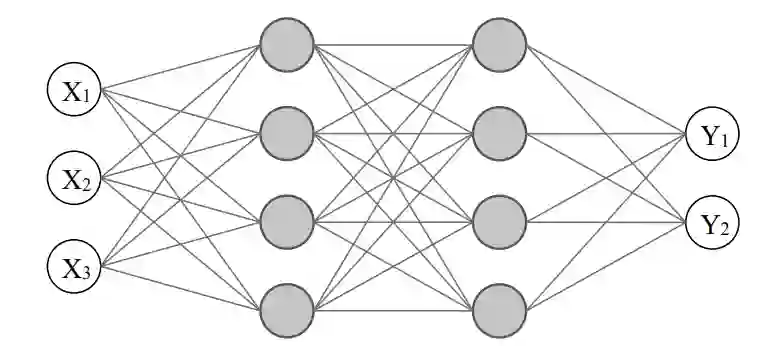 神经网络是一种多功能行为模型,其行动原理是隐含的。这种灵活的结构允许通过数据驱动方法学习各种行为。图 3 是神经网络的一个示例,由感知 𝑋1 、 𝑋2 和 𝑋3 、两个灰色显示的隐藏层以及动作 𝑌1 和 𝑌2 组成。网络中的边代表权重,是行为模型的可训练参数。在最基本的网络中,每个节点的值都是其输入的加权和,但现代网络通常会采用一些额外的非线性变换,从而大大增加了函数空间。隐藏层的数量和大小也是可调的。