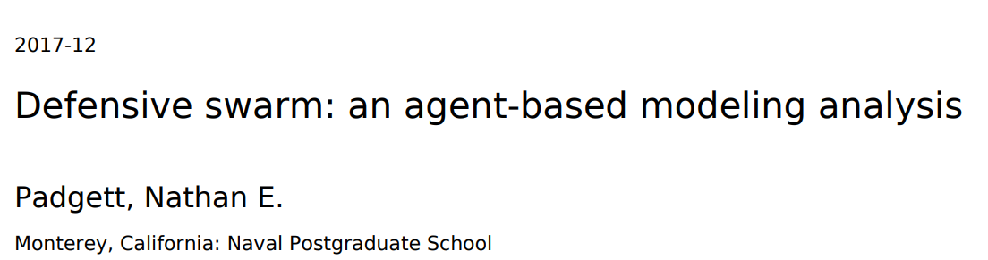 偏远军事基地的安保是一项艰巨而又关键的任务。偏远地区通常离敌方战斗人员更近,离支援部队更远;负责保卫基地的人员装备较少。这些地点通常还依赖空中补给任务来维持任务的准备状态和有效性。本论文分析了小型自主无人机群如何协助防御行动。为此,创建了一个基于智能体的计算机仿真模型,该模型创建了一个战术问题(敌人试图攻击或渗透一个假想基地),无人机群试图抵御该问题。结果表明,如果每架无人机负责覆盖的范围不超过 0.18 平方英里,并且至少有 40% 的无人机配备武器,那么蜂群可以有效阻止 95% 的攻击者。结论是,无人机是基地防御的绝佳补充,尤其有助于有机能力较弱(视野、防御资产等有限)的偏远前哨。虽然这项研究专门针对反击对中央基地的威胁,但蜂群动态算法可应用于未来的移动车队或飞机防御问题,甚至和平时期的搜索和救援等应用。