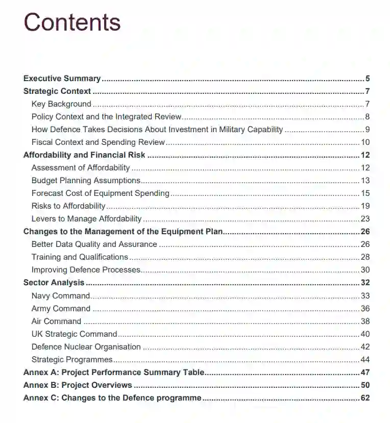 本报告反映了资金增加和政府综合审查的结果,这为英国防部的战略和政策目标提供了参考。因此,装备计划反映了对能力的重大新投资计划,但也反映了对与战略方向不太一致的领域的削减。