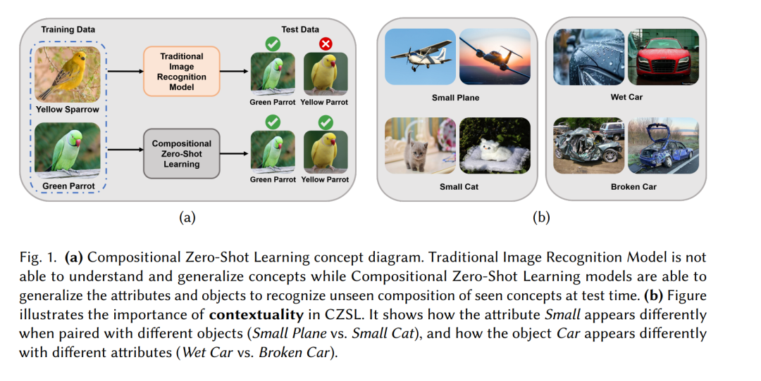 零样本学习(Zero-Shot Learning, ZSL) 是一种机器学习范式,使模型能够对训练阶段未见过的类别进行分类。其核心思想是利用辅助信息(如文本描述或语义嵌入)来弥合“已见类别”(seen classes)与“未见类别”(unseen classes)之间的语义鸿沟。ZSL 的基本原理是:通过从带标签的“已见”类别中学习到的知识,迁移并推断出“未见”类别的表示与决策。这一能力对于缓解数据稀缺问题至关重要,因为它无需为每个新类别进行大量数据收集与重新训练。因此,ZSL 使得人工智能模型更加灵活和可扩展,能够动态地识别新概念。 在众多零样本学习问题中,组合式零样本学习(Compositional Zero-Shot Learning, CZSL) [9, 15, 33–35] 是一个极具代表性的方向,其目标是识别由已知概念组合而成的全新组合。更具体地,在 CZSL 中,每个类别通常被定义为对象(object)与其属性(attribute)的组合,用以描述对象的特征或状态。在 CZSL 的零样本任务中,若已知训练组合如 “绿色鹦鹉(Green Parrot)”、“黄色麻雀(Yellow Sparrow)”和“红色汽车(Red Car)”,模型应能识别出未见过的新组合,例如“黄色鹦鹉(Yellow Parrot)”(如图1a)。
