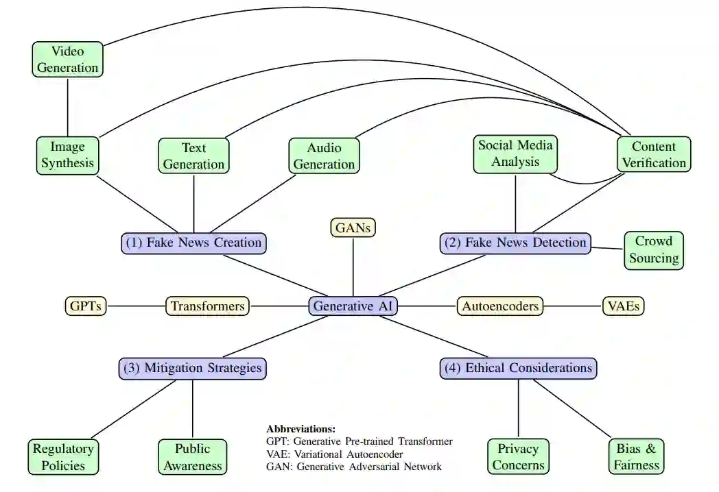 假新闻特指在形式上模仿新闻媒体内容,但在组织过程或意图上不模仿新闻媒体内容的编造信息;虚假信息是指故意传播以欺骗人们的虚假信息;错误信息是指无意误导而传播的虚假信息[3, 4]。假新闻的扩散是一项重大挑战,需要先进的检测和缓解解决方案[5]。在此背景下,生成式人工智能(GenAI)作为一种两用技术应运而生,它既能生成复杂的虚假内容,又能对其进行检测。