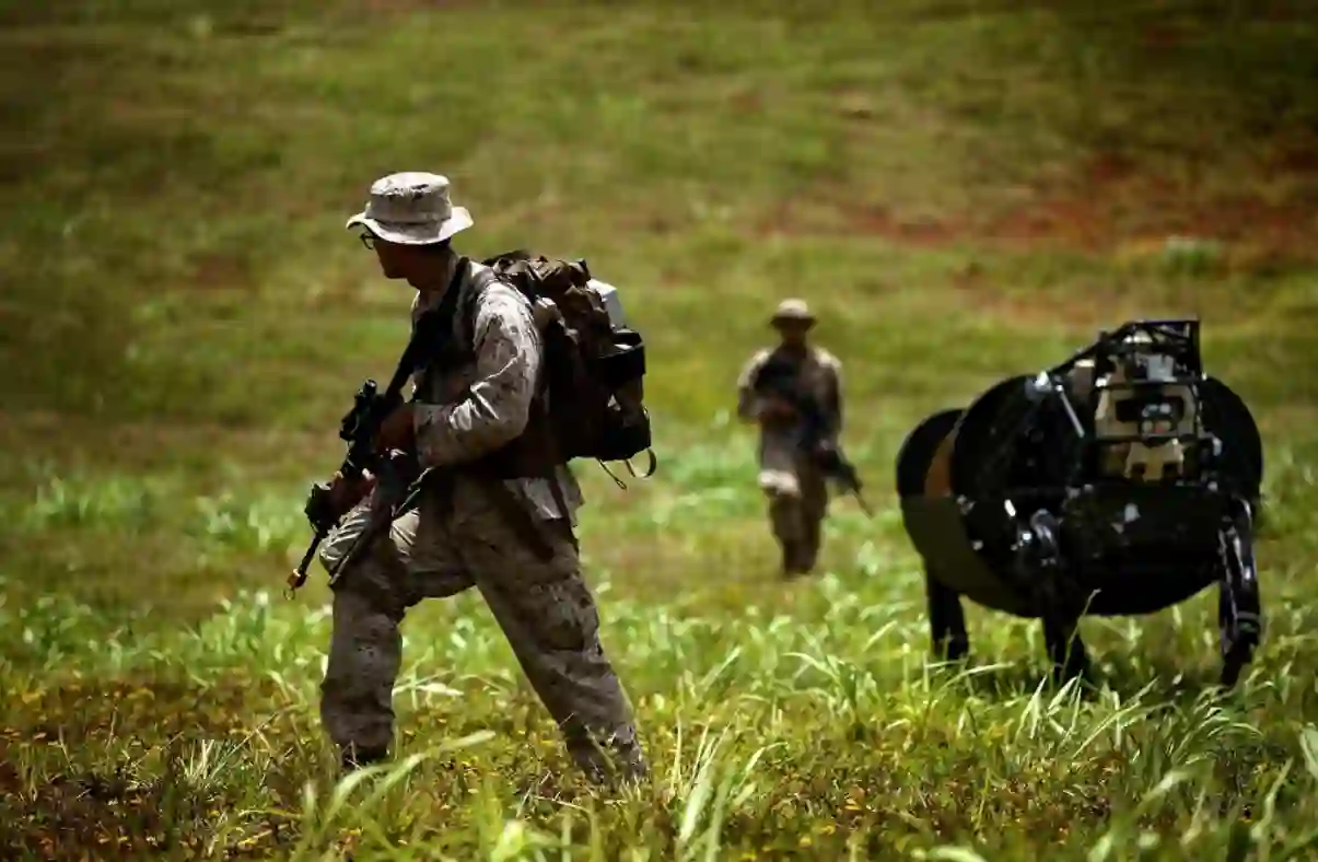 双腿小队支援系统是海军陆战队作战实验室正在测试的实验性技术。该系统经过编程,可跟随操作员穿越地形,携带水和食物等重物。图片来源:美国海军陆战队