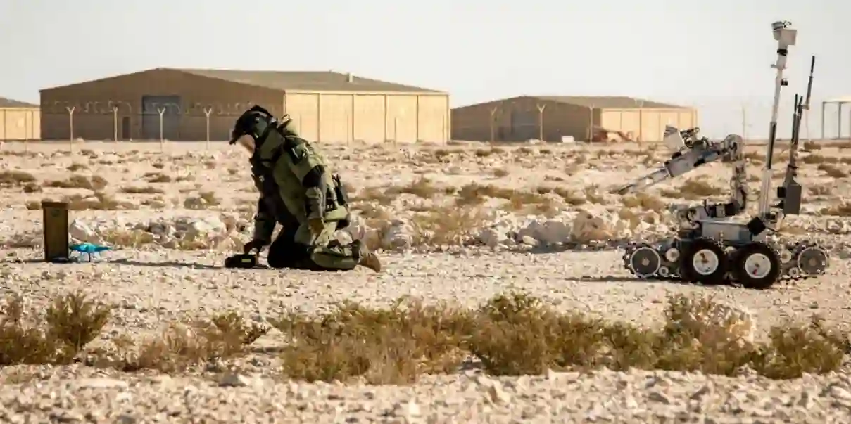 一名军官将 XRS-150 X 射线发生器放在模拟坠落的无人驾驶航空系统前。图片来源:美国空军国民警卫队