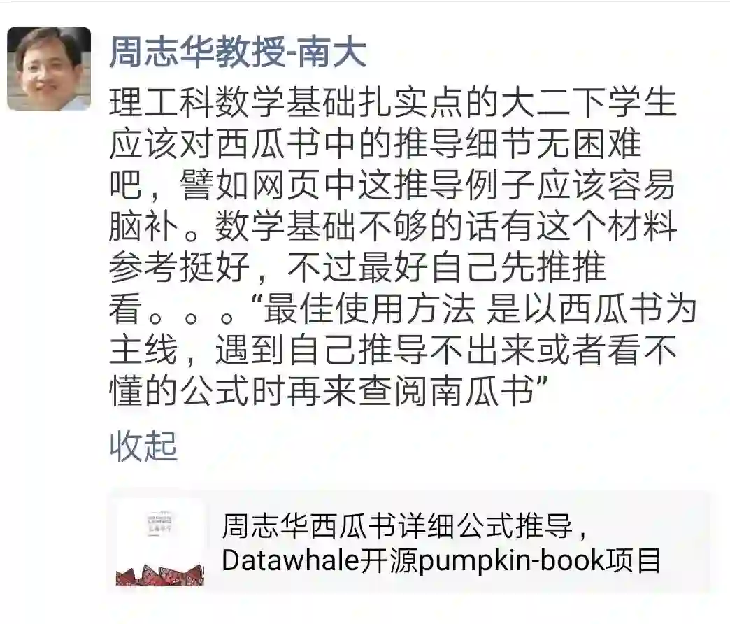 南瓜书不但得到了学习者的认可,还受到业内专家的好评,以及机器之心等众多平台推荐,并且有幸得到西瓜书作者--周志华教授本人的分享。