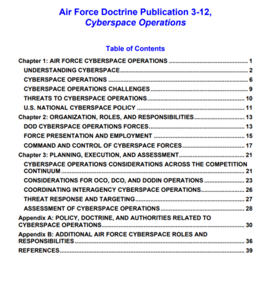 赛博空间战沿着与作战指挥部(CCMD)和军种优先事项相一致的行动路线和工作路线产生效果。赛博空间战可以独立执行,也可以与其他领域的行动相结合,以实现主要的、互补的或有利的效果。此外,赛博空间战确保重要的指挥和控制(C2)网络以及美国防部(DODIN)信息网络的保密性、完整性和可用性。赛博空间的军事行动被组织成任务,通过各种行动的组合,产生效果以实现指挥官的目标。空军赛博空间部队通过开展进攻性赛博空间战(OCO)、防御性赛博空间战(DCO)和美国防部信息网络(DODIN)行动支持这些目标。