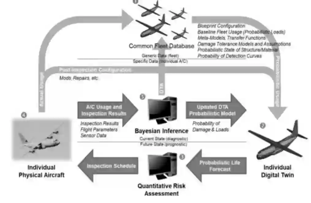 美国空军和美国国家航空航天局(NASA)提出了机身数字孪生体(ADT)框架,旨在用更健全、更概率化、基于风险的精确系统取代传统的确定性单机跟踪系统。该系统还通过了加拿大国家研究委员会(NRC)的验证。NRC 将 ADT 定义为 “as-built/as-maintained 飞机机身系统的数字表示,即对as-built 飞机机身系统进行多物理场、多尺度、概率性的综合仿真,该仿真使用最佳可用模型、传感器信息和输入数据,以反映和预测相应单个飞机机身系统在整个寿命期间的活动/性能”。NRC 对 ADT 的设想如图 6 所示。它由五个构件组成。其中 1 是通用机队数据库,2 是单个数字孪生系统,3 是定量风险评估,4 是单个物理飞机,5 是贝叶斯推理。