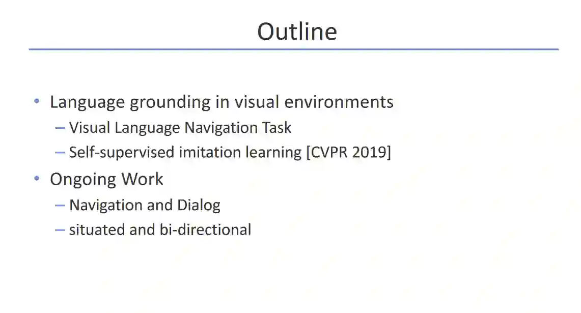 在过去的两年中,语言和视觉交叉领域出现了一些新的任务。其中最受欢迎的是2018年引入的视觉语言导航(VLN)任务。该任务将一个智能体随机放置在家中,并根据自然语言命令指示它们导航到目标目的地。要在这个领域取得成功,需要构建多模态语言地基,允许智能体成功地导航,同时对视觉语言动态进行推理。在MSR中,我们通过结合使用搜索、模仿学习和预训练的方法,显著地推动了这一领域的最新技术。关于VLN之类任务的基本假设是,我们将构建执行命令的智能体。我们训练这些智能体的方法是通过提供观察-操作元组的示例,将其转换为单向语言。我们训练我们的智能体执行我们的命令,但没有必要教智能体如何应对环境中的不确定性。在这个演讲,我将提出我们的最近在强化学习,模仿学习和VLN任务上的预训练方法方面的工作,并将我们的新思路转化为一个更一般的问题,以理解系统如何请求和接受帮助,从而探索视觉语言导航研究领域的技术转移和推广。