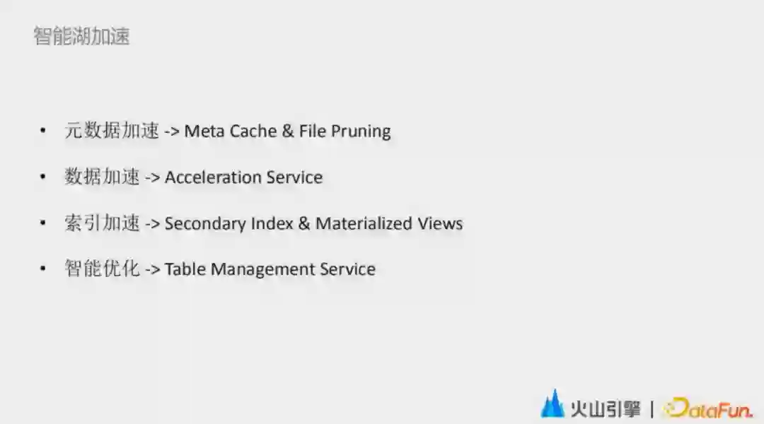 数据湖托管了文件级别的元数据,元数据的数据量相比数仓有了几个量级的增长,但同时也给我们带来了一些优化的机会。比如我们未来计划将查询的谓词直接下推到元数据系统当中,让这个引擎在scan阶段无需访问系统,直接去跳过无效文件来提升查询的性能。 * 数据的加速