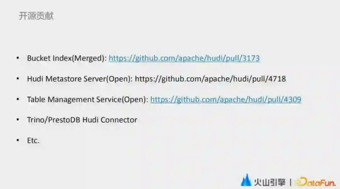 第二个维度是开源贡献。我们现在一直在积极地投入到Hudi的社区贡献当中,参与了多个Hudi的核心feature的开发和设计。其中Bucket index是我们合入到社区的第一个核心功能,而当下我们也在同时贡献着多个重要的功能,比如最早提到的解决数据难管理的Hudi MetaStore Server,我们已经贡献到社区了,去普惠到开源社区。因为我们发现Hudi MetaStore Server不止解决我们在生产实践中遇到的问题,也是业界普遍遇到的一个问题。现在也在跟Hudi社区的PMC共同探讨数据湖的元数据管理系统制定标准。