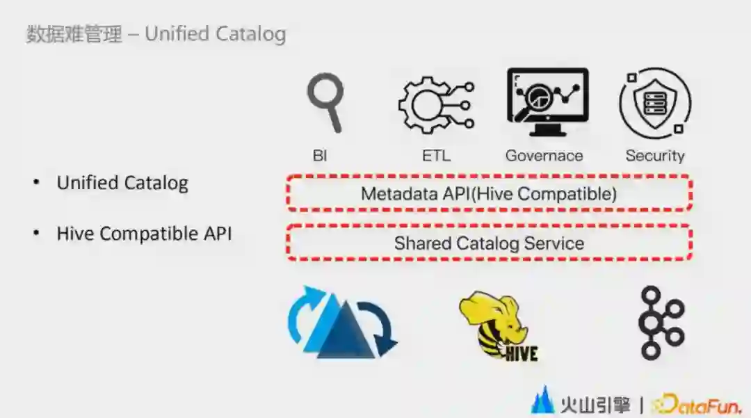 为了解决这个数据难管理的问题,Databricks 提出了一个Lakehouse 的架构,就是在存储层之上去构建统一的元数据缓存和索引层,所有对数据湖之上数据的使用都会经过这个统一的一层。这和我们的目标很相似,但是现实比较残酷,我们面临的是海量存量数据,这些存量数据不管是数据格式的迁移,还是使用方式的迁移,亦或是元数据的迁移,都意味着巨大的投入。因此在很长一段时间里,我们都会面临数仓和数据湖共存这样一个阶段。在这一阶段,两者的连通性是用户最为关心的。 我们在数据湖和数仓之上,构建了一层统一的元数据层,这层元数据层屏蔽了下层各个系统的元数据的异构性,由统一的元数据层去对接 BI 工具,对接计算引擎,以及数据开发、治理和权限管控的一系列数据工具。而这一层对外暴露的 API 是与 Hive 兼容的。 尽管 Hive 这个引擎已经逐渐被其他更新的计算引擎代替了,比如Spark、Presto、Flink,但是它的源数据管理依旧是业界的事实标准。另外,一些云厂商即使选择构建了自己的元数据服务,也都同时提供了和 HMS 兼容的元数据查询接口,各个计算引擎也都内置了Hive Catalog 这一层。