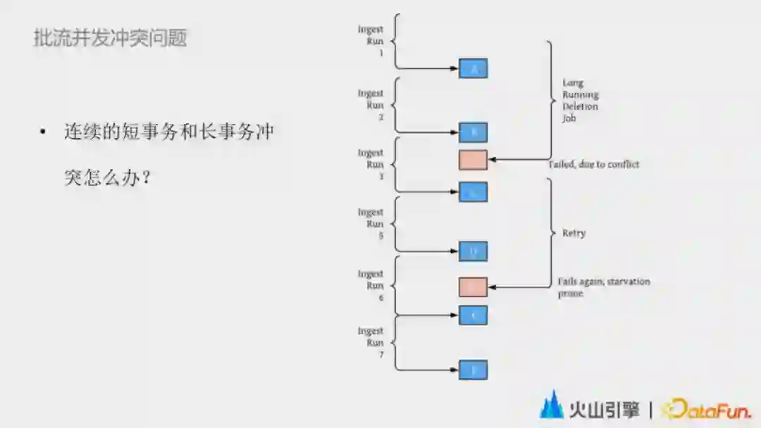 下一步的并发问题是批流并发冲突的问题。批流并发冲突问题类似于一个我们在传统数据湖中遇到的场景,就是有一连串的小事务和一个周期比较长的长事务,如果这两者发生冲突,应该如何处理。
