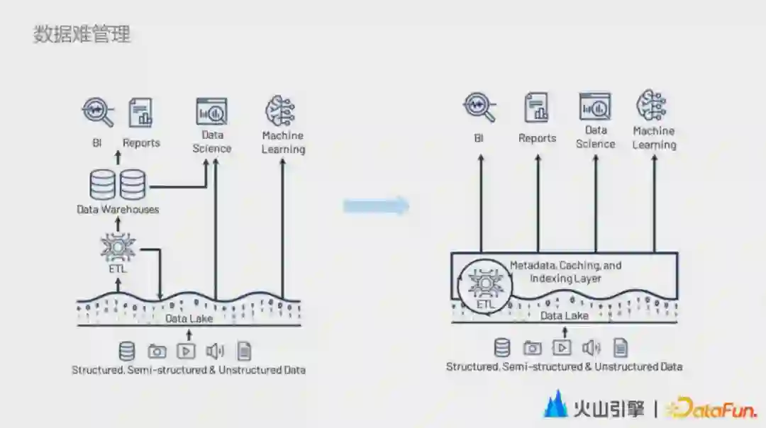 下图是一个典型的基于中心化存储构建数仓机器学习和数据科学的架构。这里将加工过后的数据保存在数仓中,通过数仓的元数据进行组织。数据科学家和机器学习框架都会直接去这个中心化的存储中获取原始数据。因此在这个中心化存储之上的数据对用户来说是完全分散的,没有一个全局的视图。