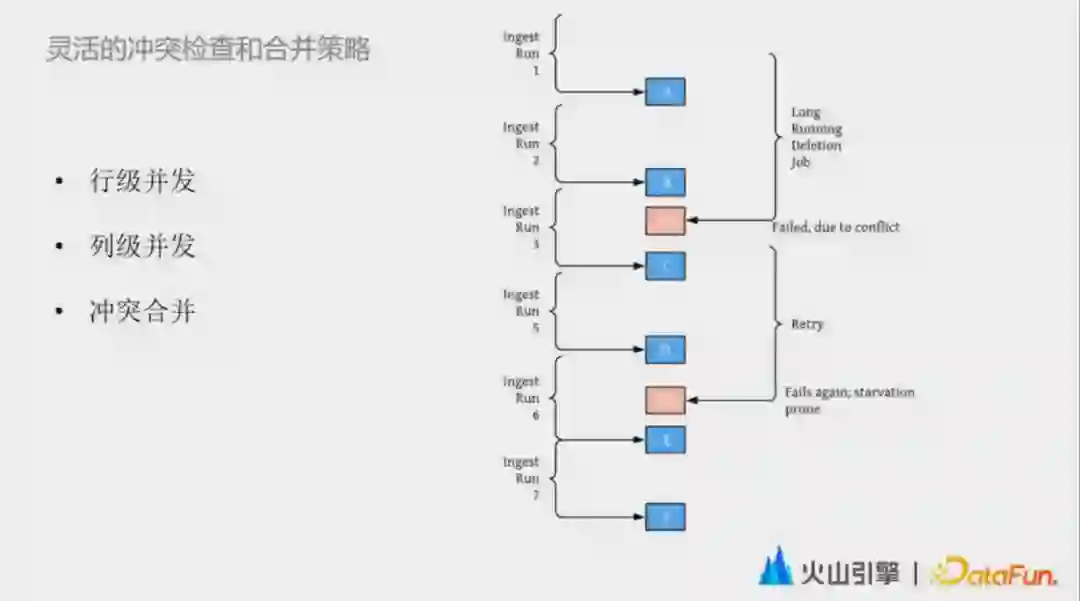 **为了解决批流冲突的问题,我们的思路是提供更灵活的冲突检查和数据合并策略。**最基础的就是行级并发。首先两个独立的writer写入的数据在物理上是隔离的,借助文件系统的租约机制也能够保证对于一个文件同时只有一个writer。所以这个冲突实际上不是发生在数据层面的,而是发生在元数据层面。那数据的冲突与否,就可以交由用户来定义。很多时候入湖的数据实际上并不是一个现实中正在发生的事情,而是一个现实操作的回放。比如图中的这个场景,我们假设删除的作业是针对一个特定的 Snapshot。即使有冲突,我们可以认为整个删除的过程是瞬时完成的,后续的新事物可以追加发生在这次删除作业之后。