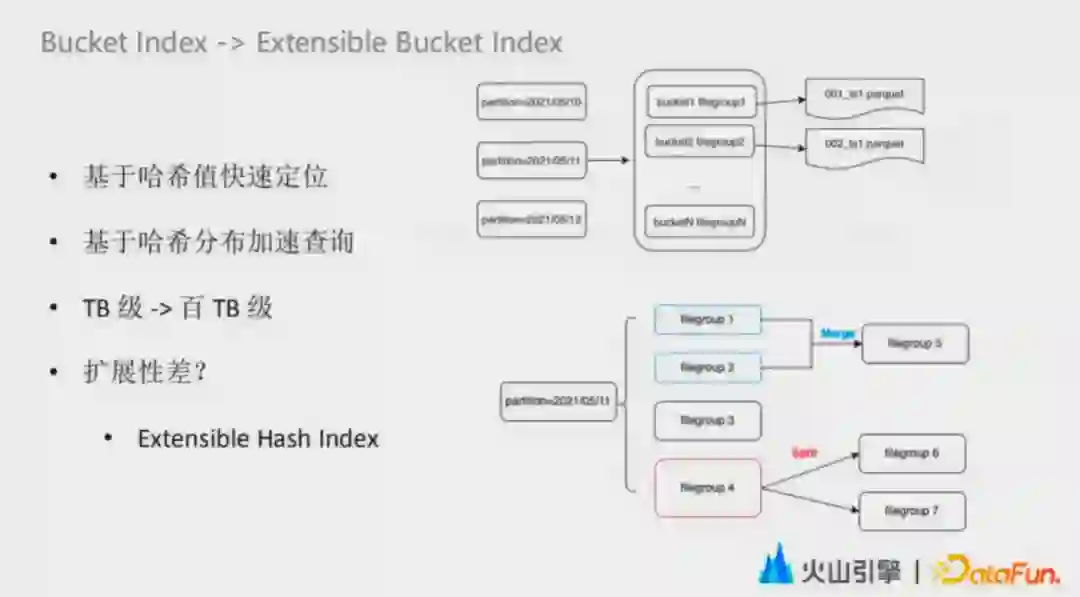Bucket Index原理比较简单,整个表或者分区相当于是一张哈希表,文件名中记录的这个哈希值,就相当于哈希表中这个数组的值。可以根据这个数据中的主键哈希值快速定位到文件组。一个文件组就类似于哈希表中的一个链表,可以将数据追加到这个文件组当中。Bucket Index成功地解决了流式更新性能的问题。由于极低的定位数据的成本,只要设置了一个合适的bucket桶大小,就能解决导入性能的问题,将流式更新能覆盖的场景从 TB 级别扩展到了百 TB 级别。除了导入的性能,Bucket Index 还加速了数据的查询,其中比较有代表性的就是 bucket Pruning和bucket join。 当然这种索引方式也遇到了扩展性的问题,用户需要提前一步做桶数的容量规划,给一个比较安全的值,避免单个桶扩大,以便应对接下来的数据增长。在数据倾斜的场景下,为了让倾斜值尽可能分散在不同的bucket,会将bucket的数量调到很大。而每个bucket平均大小很小,会带来大量的小文件,给文件系统带来冲击的同时也会带来查询侧性能下滑和写入侧的资源浪费。同时在一线快速增长的业务,很难对容量有一个精准的预估。如果估算少了,数据量飞速增长,单个的bucket的平均大小就会很大,这就会导致写入和查询的并发度不足,影响性能。如果估算多了,就会和倾斜的场景一样出现大量的小文件。整体的rehash又是一个很重的运维操作,会直接影响业务侧对数据的生产和使用。因此不管从业务的易用性出发,还是考虑到资源的使用率和查询的效率,我们认为兼具高效导入和查询性能,也能支持弹性扩展的索引系统是一个重要的方向。 这时我们想到了可扩展hash这个数据结构。利用这个结构,我们可以很自然地做桶的分裂和合并,让整个bucket的索引从手动驾驶进化到自动驾驶。在数据写入的时候,也可以快速地根据现有的总数,推断出最深的有效哈希值的长度,通过不断地对 2 的桶深度次方进行取余的方式,匹配到最接近的分桶写入。我们将Bucket Index这个索引贡献到了社区,已在Hudi的0.11版本对外发布。 4. 日志难入湖