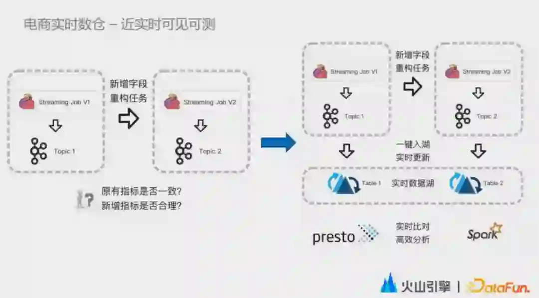 我们切入的第一个阶段是实时数据的近实时可见可测。 坦白说,在实时数据湖的落地初期,对于数据湖是否能在实时数仓中真正胜任,大家都是存疑的。因此最早的切入点也比较保守,用在数据的验证环节。在电商的实时数仓中,由于业务发展快,上游系统变更,以及数据产品需求都非常多。导致实时数仓开发周期短,上线变更频繁。当前这个实时的数据的新增字段和指标逻辑变更,或者在任务重构优化时,都要对新版本的作业生成的指标进行验证。验证的目标主要有两点,一是原有指标,数据是否一致,二是新增指标的数据是否合理。 在采用数据湖的方案之前,数据湖的验证环节需要将结果导入到Kafka然后再dump到 Hive,进行全量数据校验。这里存在的一个问题就是数据无法实时或者近实时可见可检的,基本上都是一个小时级的延迟。在很多紧急上线的场景下,因为延时的问题,只能去抽测数据进行测试验证,就会影响数据质量。实时数据湖的方案,是通过将实时数据低成本的增量导入到数据湖中,然后通过Presto进行查询,然后进行实时计算汇总,计算的结果做到近实时的全面的可见可测。