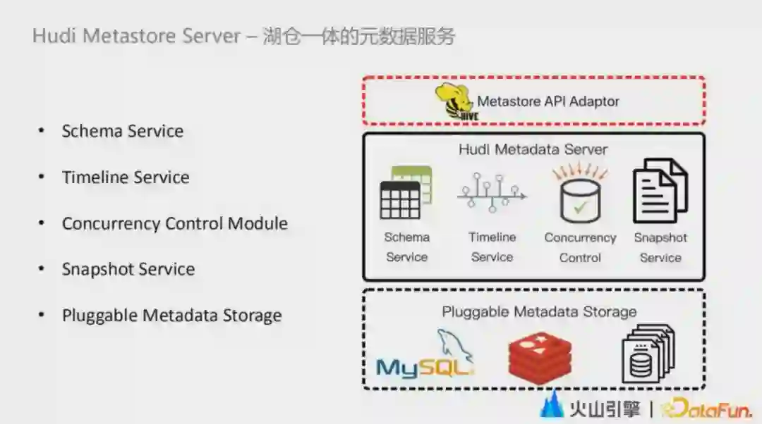 首先,Hudi Metastore Server 提供了多租户的、中心化的元数据管理服务,将文件一级的元数据保存在适合随机读写的存储中,让数据湖的元数据不再分散在多个文件当中,满足了single source of true。 其次,Hudi Metastore Server 针对元数据的查询,尤其是一些变更操作。比如Job position 提供了与 Hive Metastore完全兼容的接口,用户在使用一张数据湖上的表的时候,享受到这些增加的高效更新、删除、增量消费等能力的同时,也能享受到一张 Hive 表所具备的功能,例如通过Spark、Flink、Presto查询,以及在一些数据开发工具上在线的去获取到元数据以及一些分区 TTL清理的能力。 此外,Hudi Metastore Server还解决了一个关键性的问题,就是多任务并发更新弱的问题。