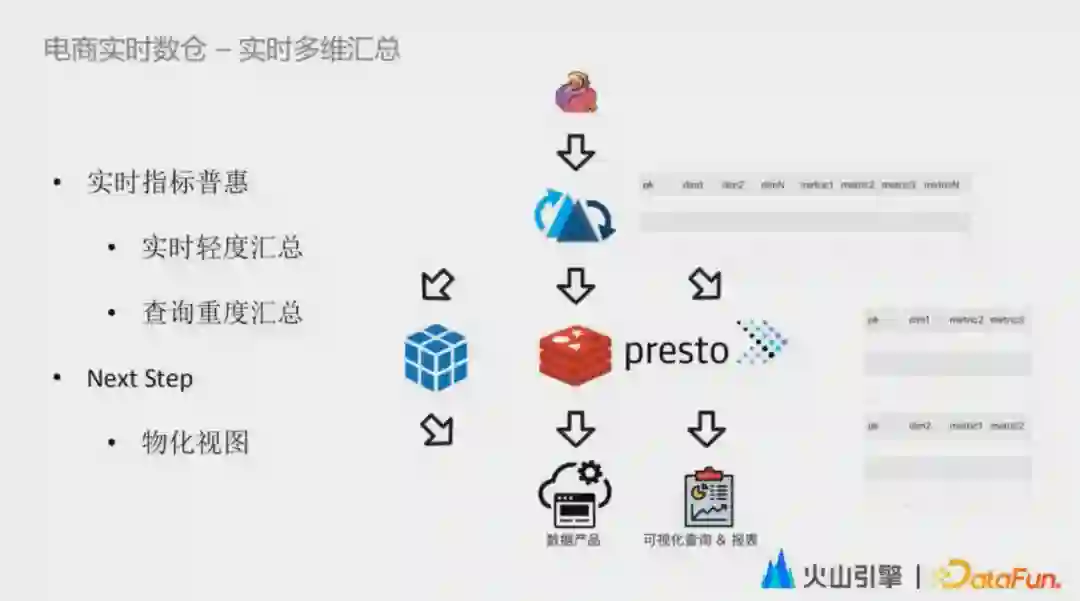 在查询的优化上面,我们优化了读文件系统的长尾问题,支持了实时表的列裁剪。同时我们对Avro日志进行了短序列化和序列化的case by case的优化,还引入了列存的 log进一步提升查询性能。除了实时数据分析之外,这种能力还可以用于机器学习。在特征过程当中,有些label是可以快速地从日志中实时获取到的。比如对一个视频点了个赞,和特征是可以关联上的。 有些label的生成则是长周期的,比如在抖音上买了一个东西,或者把一个东西加入购物车,到最后的购买,这整个链路是很长的,可能涉及到天级别或者周级别的一个不定周期。但是在这两种情况下,它的特征数据基本上都是相同的,这也使底层的存储有了批流两种使用方式的诉求,以往都是通过冗余的存储和计算来解决的。通过数据湖可以将短周期的特征和标签实时地入湖,长周期的每天做一次调度,做一个批式入湖,真正能做到一份数据去适用多个模型。 第三个阶段的应用场景是数据的实时多维汇总。 在这个阶短最重要的目标是实时数据的普惠。因为很多的实时数据使用方都是通过可视化查询或者是数据服务去消费一个特定的汇总数据,而这些重度汇总过后的实时数据使用率相对来说是比较低的。因此我们和数仓的同学共同推进了一个实时多维汇总的方案落地。数仓的同学通过实时计算引擎完成数据的多维度的轻度汇总,并且实时地更新入湖。下游可以灵活地按需获取重度汇总的数据,这种方式可以缩短数据链路,提升研发效能。