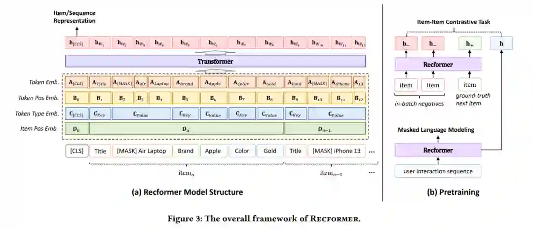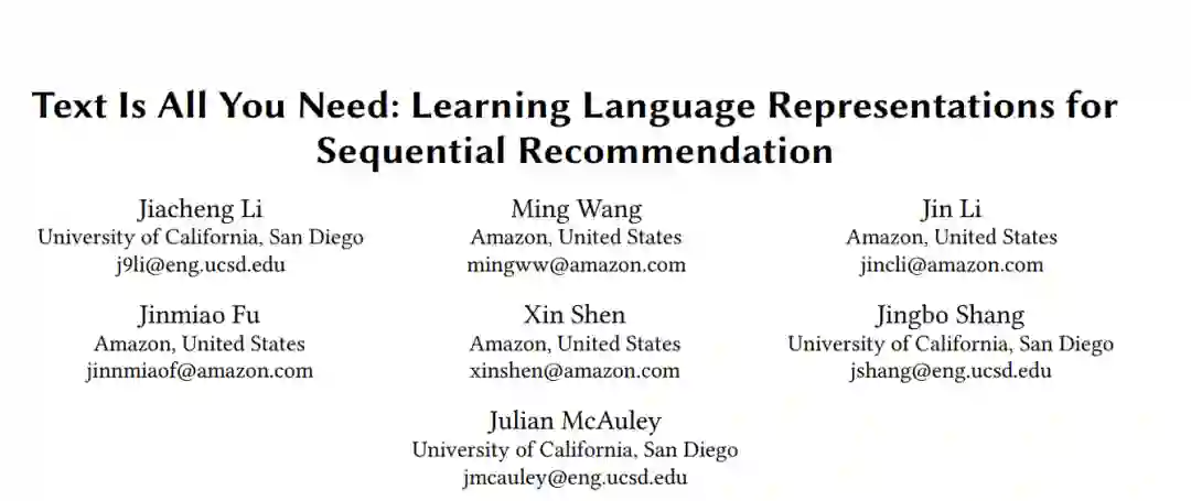 序列推荐的目标是通过历史交互来模拟用户的动态行为。现有的方法依赖于明确的商品 ID 或者通用的文本特征进行序列模型的理解用户喜好。然而,这些方法仍然难以处理冷启动商品,或将知识迁移到新的数据集上。在这篇文章中,我们提出将用户偏好和商品特征建模为可以泛化到新商品和数据集的语言表示。为此,我们提出了一个新颖的框架,名为 Recformer,该框架可以有效地学习用于序列推荐的语言表示**。具体来说,我们提出将一个项目视为一个由文本描述的项目键值属性展开的“句子”(词序列),这样用户的一个项目序列就变成了一个句子序列**。对于推荐,Recformer被训练来理解“句子”序列并检索下一个“句子”。为了编码项目序列,我们设计了一个类似于Longformer的双向Transformer模型,但在序列推荐中使用了不同的嵌入层。为了有效的表示学习,我们提出了新颖的预训练和微调方法,这些方法结合了语言理解和推荐任务。因此,Recformer可以有效地根据语言表示推荐下一个项目。在六个数据集上进行的广泛实验表明了Recformer在序列推荐,特别是在资源少和冷启动设置中的有效性。