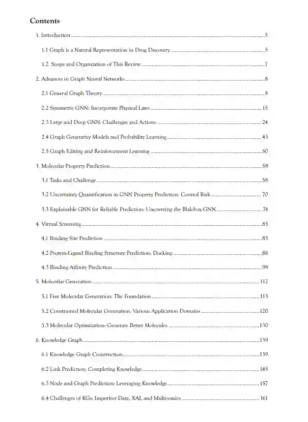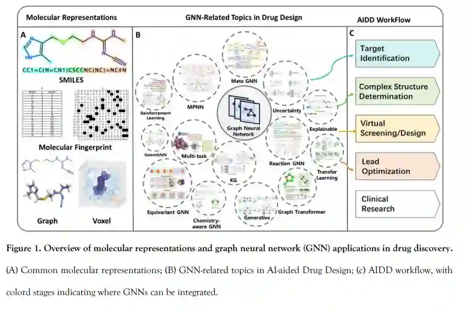 图神经网络(GNNs)作为深度学习中具备拓扑/结构感知能力的模型,已成为人工智能辅助药物发现(AIDD)中的强大工具。通过直接作用于分子图,GNNs 提供了一种直观且富有表现力的框架,用于学习类药分子复杂的拓扑和几何特征,从而巩固了其在现代分子建模中的重要地位。本文综述了 GNN 在药物发现中的方法基础与代表性应用,涵盖了分子性质预测、虚拟筛选、分子生成、生物医学知识图谱构建和合成路径规划等任务。我们重点介绍了一些最新的方法进展,包括几何图神经网络、可解释模型、不确定性量化、可扩展图结构以及图生成框架。同时,文章还探讨了这些模型如何与现代深度学习方法融合,如自监督学习、多任务学习、元学习与预训练。贯穿全文,我们也指出了 GNN 在实际药物研发流程中面临的挑战与方法瓶颈,并在最后讨论了未来的发展方向。 关键词:图神经网络;分子图;深度学习;人工智能辅助药物发现;分子建模