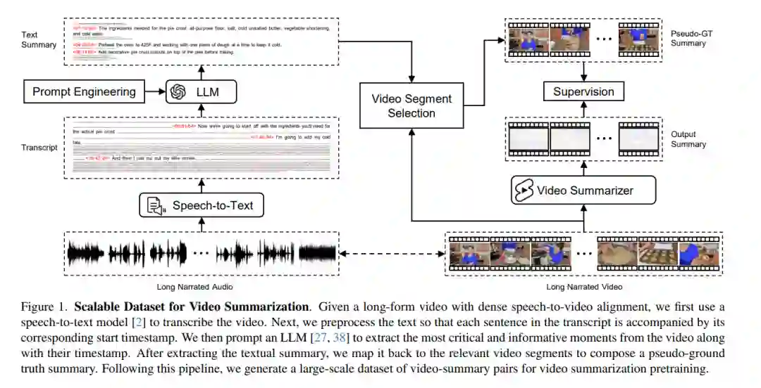长篇视频内容占据了互联网流量的大部分,使得自动视频摘要成为一个重要的研究问题。然而,现有的视频摘要数据集在其规模上明显有限,限制了最先进方法的泛化效果。我们的工作旨在通过利用大量的长篇视频以及密集的语音到视频对齐,加上最近大型语言模型(LLMs)在长文本摘要方面的显著能力,来克服这一限制。我们引入了一个自动化且可扩展的流程,使用LLMs作为Oracle摘要器,来生成大规模的视频摘要数据集。通过利用生成的数据集,我们分析了现有方法的局限性,并提出了一个新的视频摘要模型,有效地解决了这些问题。为了进一步推动该领域的研究,我们的工作还提出了一个新的基准数据集,包含1200个长视频,每个视频都有专业人士注释的高质量摘要。广泛的实验清楚地表明,我们提出的方法在几个基准测试中设定了新的视频摘要的最先进水平。