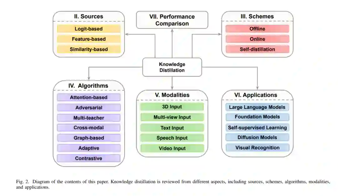 这一概念最早由 [9] 提出,并在 [10] 中被正式命名为知识蒸馏(KD),其核心思想是通过模拟教师模型的输出分布(软标签)来训练学生网络。 除了参数量庞大外,这些大型模型的训练还需要大量标注数据。KD的另一个重要用途是知识迁移,即将源任务中的知识迁移到缺乏足够标注数据的目标任务中。此外,在涉及数据隐私的场景中,数据无关的知识蒸馏(data-free KD)则通过合成数据生成,避免了存储敏感数据的需求。KD面临的主要挑战包括:如何选择要迁移的知识、采用何种蒸馏算法,以及如何设计合适的教师与学生架构。图1展示了典型的教师-学生KD结构。 随着KD研究论文数量的迅速增长及其在多任务、多领域中的广泛应用,已有若干综述工作试图从不同角度对该领域进行总结。例如,[11] 从知识类型、算法和策略等方面对KD进行了全面回顾,并对不同方法进行了比较;[12] 聚焦于视觉任务中基于教师-学生架构的模型压缩方法;[13] 通过引入新指标对KD方法进行精度与模型大小上的评估;[14] 则基于蒸馏知识源类型对现有方法进行了分类;更近期的 [15] 对不同表征形式下的知识优化目标进行了深入综述,[16] 则对以往综述进行了扩展,并简要讨论了视觉-语言模型(VLMs)中的蒸馏及数据有限情形下的挑战。 尽管上述综述涵盖了多个重要视角,但它们也存在一些明显的局限性。首先,这些工作在分析已有方法时,往往忽略了近年来在特征级蒸馏(feature-based distillation)方面的重大进展,而该方向目前已成为最主流的研究路径之一。此外,自适应蒸馏(adaptive distillation)和对比蒸馏(contrastive distillation)等新兴算法类别几乎未被提及。其次,随着基础模型与LLMs的快速发展,其在知识蒸馏中的巨大潜力并未被现有综述充分讨论。例如,[11] 作为当前最具影响力的综述之一,并未详细探讨基础模型和LLMs中KD的应用。第三,目前尚无综述研究KD在三维输入(如点云)上的应用。随着三维任务在顶级会议中受到越来越多关注,相关模型与方法的缺乏使得KD在该领域的应用显得尤为重要。表I展示了现有综述与本工作的比较。 因此,本文提出了一个对知识蒸馏方法的系统性综述,涵盖多个维度:蒸馏源、蒸馏算法、蒸馏策略、模态划分及应用领域。 本综述对三类蒸馏源进行了分类与分析:基于logits、基于特征、基于相似性的蒸馏方法,特别强调了近年来特征蒸馏方面的研究进展。 在算法层面,本文回顾了包括注意力机制、对抗式、多教师、跨模态、图结构、自适应及对比蒸馏等方法。其中,自适应与对比蒸馏作为两个尚未被系统综述的热点领域,在本工作中首次被单独归类。 在蒸馏策略方面,涵盖了离线蒸馏、在线蒸馏及自蒸馏方法。相比以往工作,本文新增了一部分内容,系统梳理了基于模态的蒸馏方法,包括视频、语音、文本、多视角(multi-view)以及三维数据。 在应用方面,本文对知识蒸馏在多个关键领域的应用进行了深入探讨,包括自监督学习、基础模型、Transformer架构、扩散模型、视觉识别任务及大语言模型。此外,还对典型方法进行了量化比较,并讨论了当前面临的挑战与未来研究方向。 图2展示了本文的组织结构。总的来说,本文的主要贡献包括: * 提出一个全面的知识蒸馏综述,从蒸馏源、算法、策略、模态及应用等多角度系统总结现有方法; * 对近年来涌现的特征蒸馏方法进行重点分类与归纳,反映其在实际应用中的重要性; * 首次引入“自适应蒸馏”和“对比蒸馏”两类新算法,尤其是在如CLIP等基础模型出现后,对比蒸馏的重要性日益突出; * 回顾了多视角与三维数据中的知识蒸馏方法,填补了该领域综述中的空白; * 深入探讨了KD在自监督学习、基础模型、Transformer、扩散模型和LLMs中的应用,特别强调在参数量巨大的LLMs中蒸馏的重要性; * 提供了典型蒸馏方法的量化对比,并总结了当前的研究挑战与未来的研究方向。