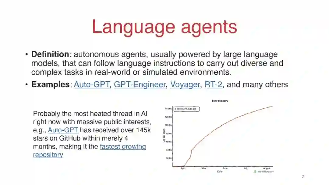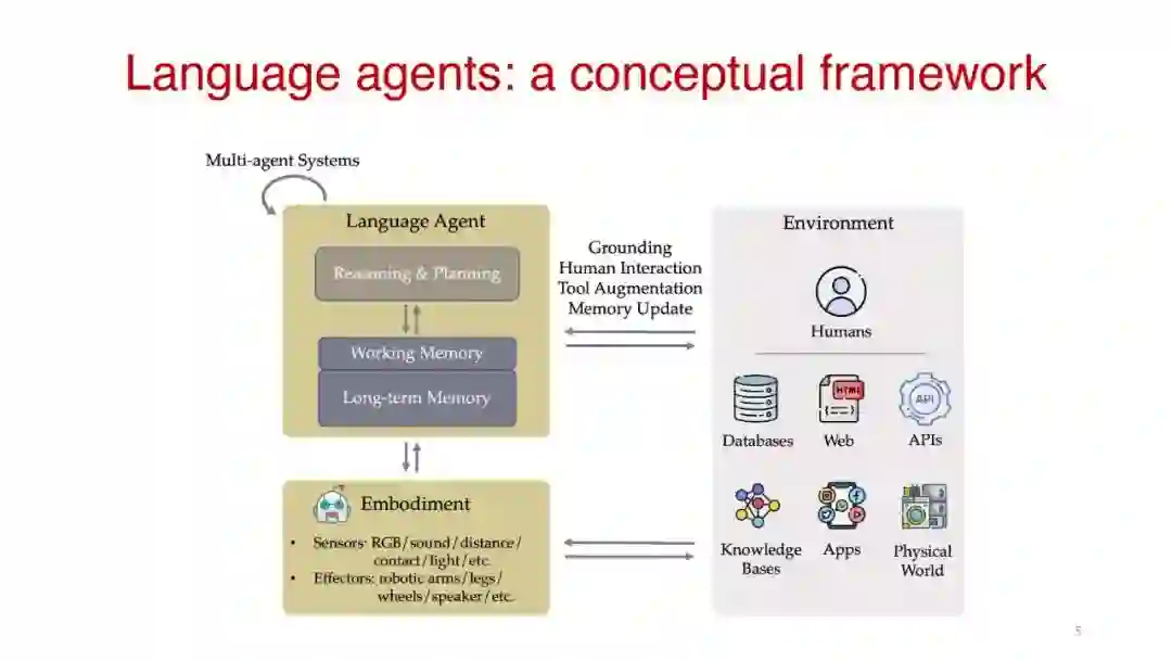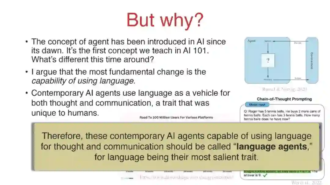 人工智能近来的焦点是自主智能体,通常由大型语言模型(LLMs)提供动力,这些智能体可以遵循语言指令,在现实世界的环境中自主执行复杂任务。然而,自从人工智能问世以来,智能体概念一直被引入到人工智能中,那么这一次有什么不同呢?我认为最根本的变化是使用语言的能力。当代人工智能智能体使用语言作为思维和交流的工具,这使它们能够进行复杂的推理、理解多样化的环境感知,并轻松与人类进行沟通。使用语言已经被证明对于生物智能的进化至关重要:尽管像老鼠甚至蠕虫这样的动物已经具有有限的推理和学习能力,但在语言的帮助下,人类的智能更加复杂。现在,人工智能正在追随类似的进化路径。因此,我建议将这些当代人工智能智能体称为“语言智能体”,因为语言是它们最显著的特征。开发和理解这种语言智能体是迈向更普遍人工智能的必要步骤。在这个演讲中,我将首先描述一个关于语言智能体的可能概念框架,并简要涉及重要主题,如记忆、工具使用、基础和推理。然后,我将简要介绍我们最近在语言智能体领域的几项工作,包括1)Mind2Web,旨在开发适用于任何现实世界网站的通用语言智能体,2)LLM-Planner,利用LLMs进行机器人规划,以与物理环境交互,3)Pangu,一个通用的神经符号框架,用于开发不同环境(例如知识图谱、数据库和网站)的语言智能体,其中包括一个符号智能体和一个神经LM协同工作。